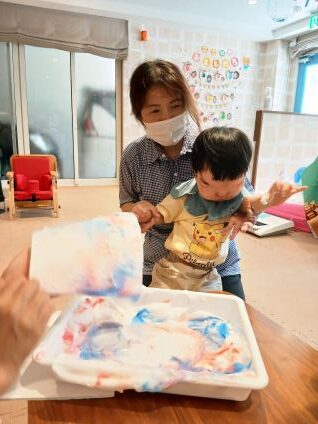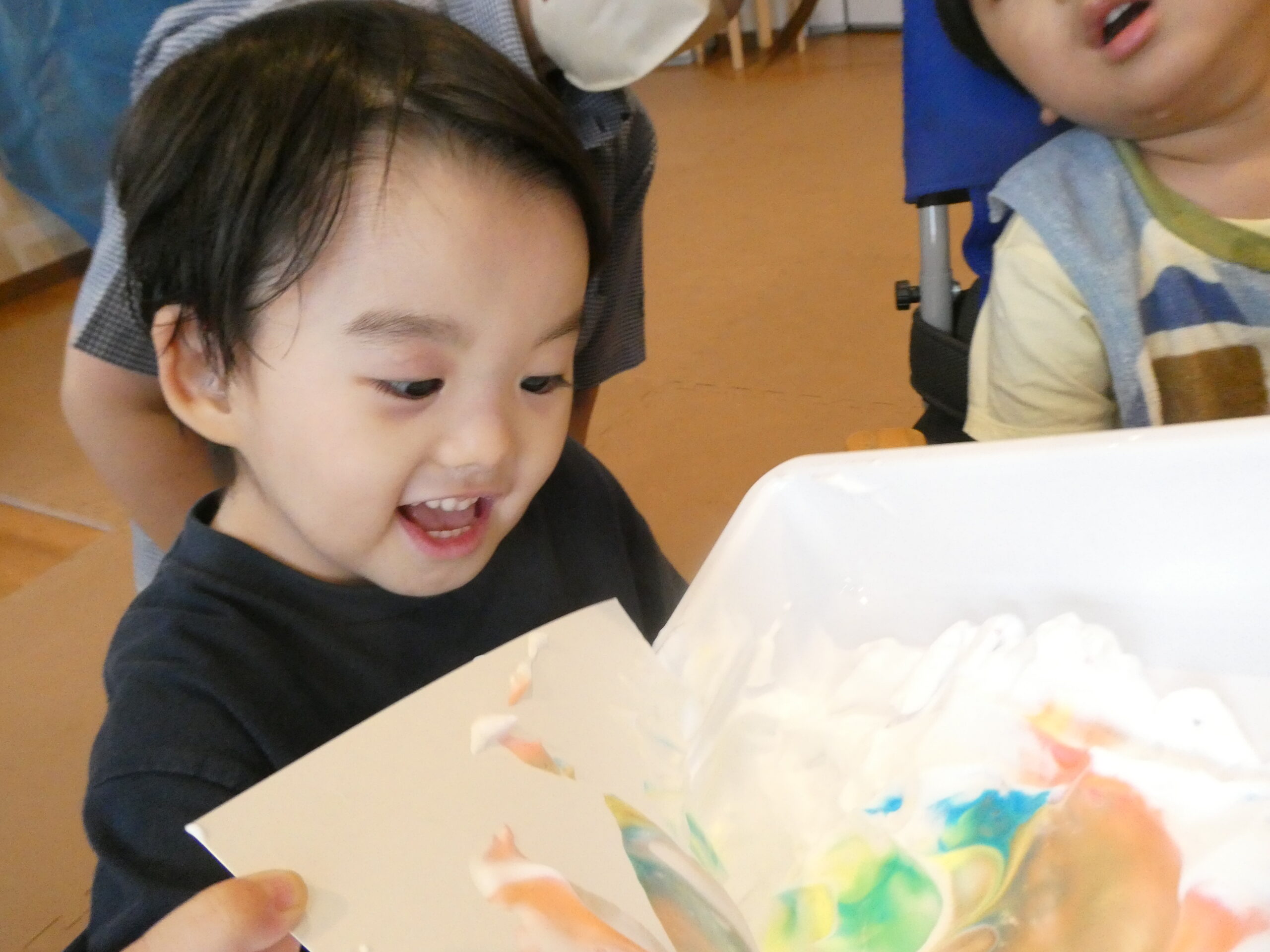 今月のテーマは「選択をしよう」だったので、絵の具の色を選んでもらい、泡の上に垂らしたら、色付きの雲のようになりました。紙に乗せるとマーブル状に色がつき、とっても幻想的!!