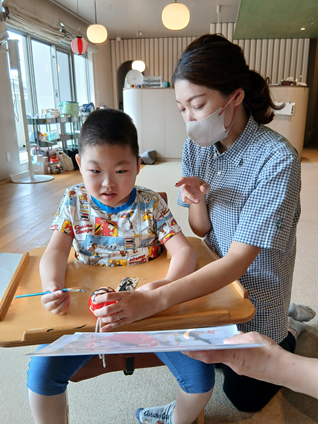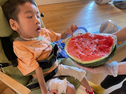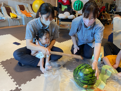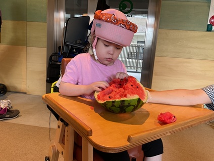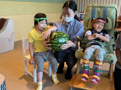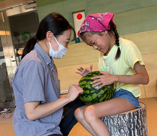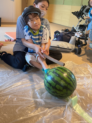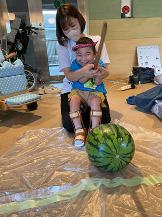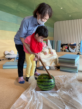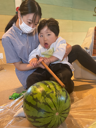 スイカを優しく叩くお子様や、立って力強く棒を振り下ろすお子様など、様々な個性が出るスイカ割りで、お友達を応援するお子様もたくさんいて、とても楽しい時間になりました♪