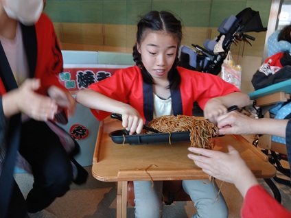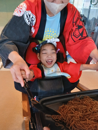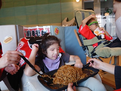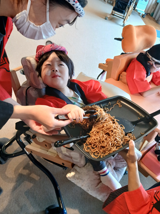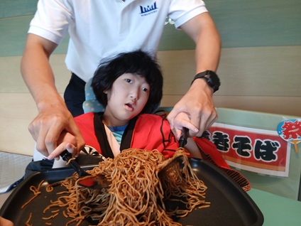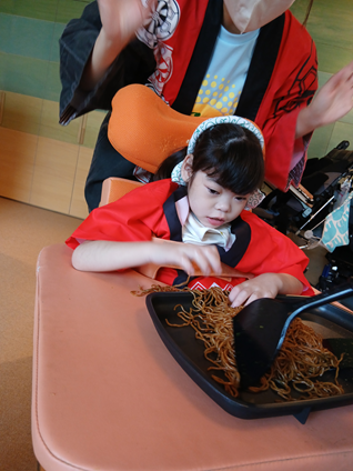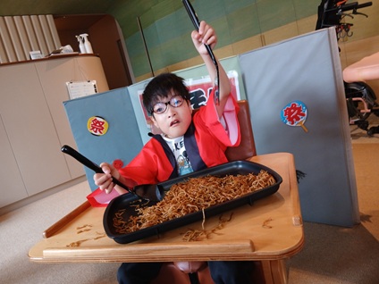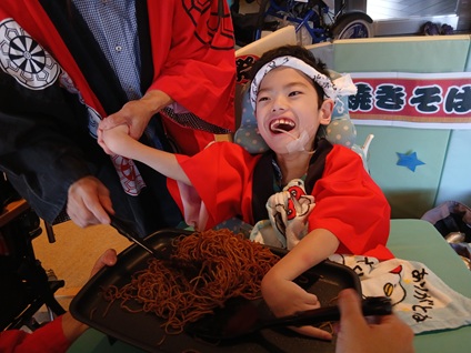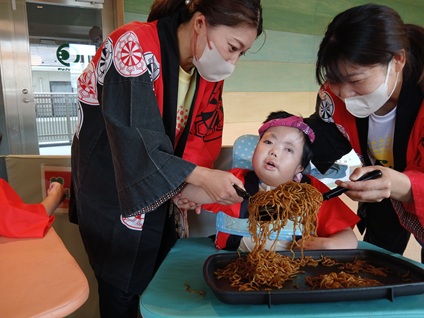 あらかじめスタッフが作っておいた焼きそばを、熱していない鉄板の上にのせ、法被を着たお子様たちが、両手にヘラを持って、ソースの香りを楽しみながら、混ぜたり持ち上げたりして楽しみました♪
