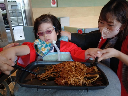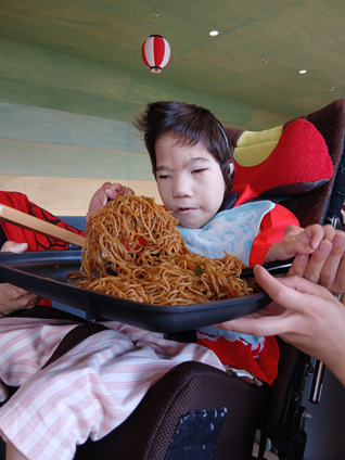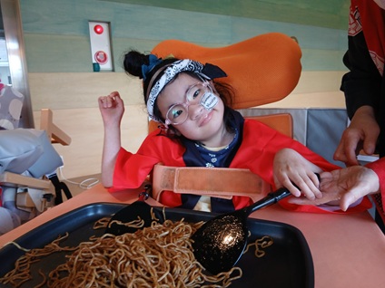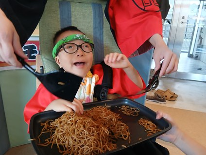 ヘラで焼きそばを持ち上げた時に、ソースの香りがすると口をもぐもぐ動かすお子様や、舌を出すお子様がいました!スタッフと一緒にヘラを握って、焼きそばを「よいしょー」とひっくり返したり、持ち上げて落としたりしてみると、焼きそばがダイナミックに動く様子に笑顔のお子様がたくさんいました♪
