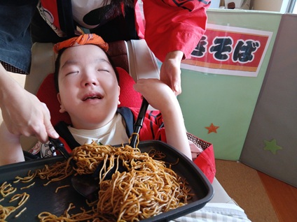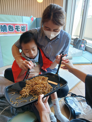 今年の夏祭りは、焼きそばの屋台の出店です!室内には提灯や出店の看板を飾りつけ、お囃子のBGMを流して夏祭りの雰囲気を味わいながら開店です!