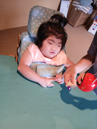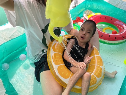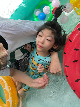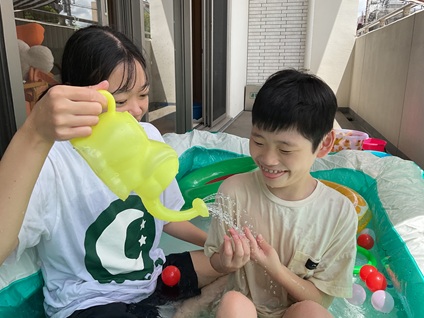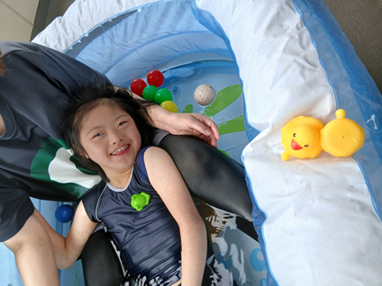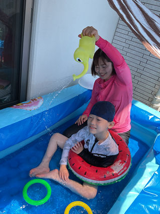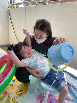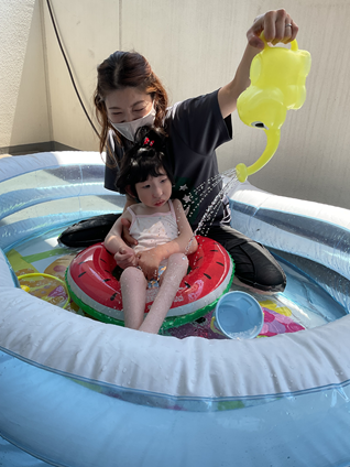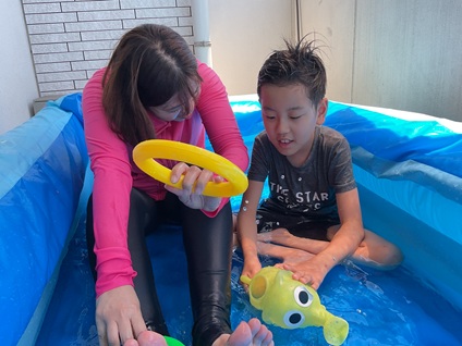 水の中でゆらゆらリラックスタイムのお子様もいれば、アヒルやカエルの玩具がお気に入りのお子様がいたり、ペットボトルの手作りジョウロから出る水に大喜びするお子様も🔫