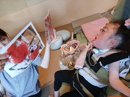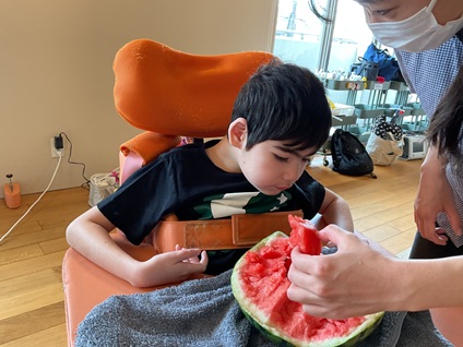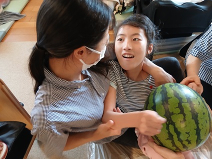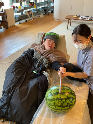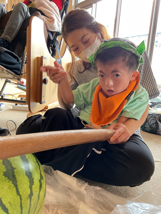 割れたスイカの香りをかいだり、最初に触れた緑の皮の部分とは違う赤い果肉部分に触れてみたり、見た目や感触の違いを感じることができました。