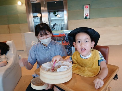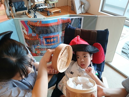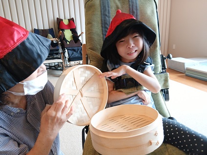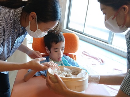 お子様たちには、トングやフォークを使って、せいろの中にシウマイを入れてもらいました。
