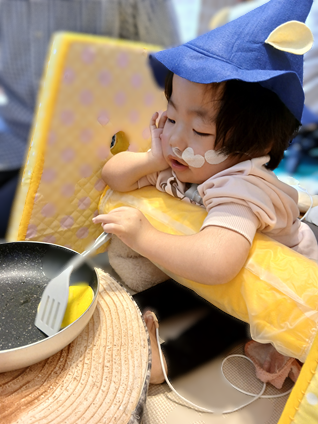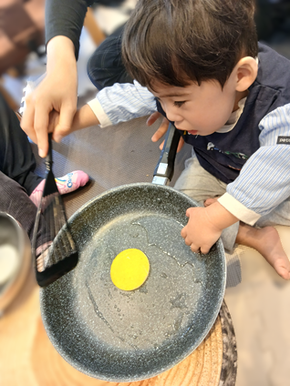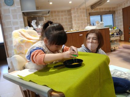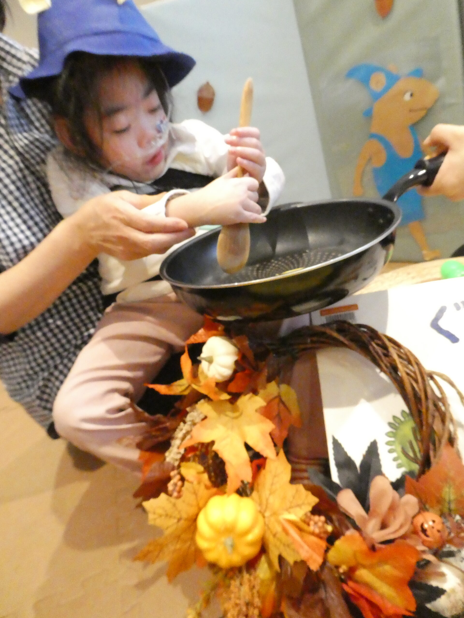 子どもにも大人にも大人気のぐりとぐらのお話を題材に、様々な活動を体験しました。こちらは『ぐりとぐらのカステラ作り』の制作の様子です