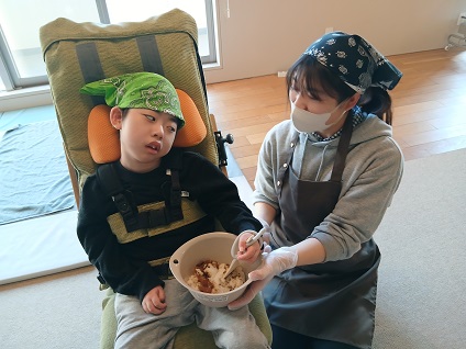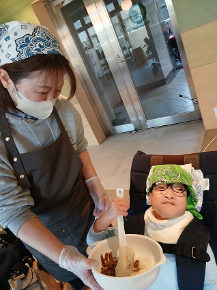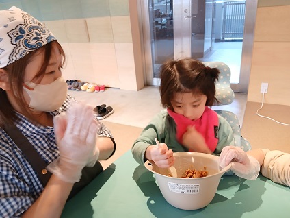 ヘラを上手に使って一人で混ぜるお子様、ヘラが手から離れてしまわないように補助具を使って混ぜるお子様、スタッフと一緒にヘラを握るお子様等、それぞれのやり方で鶏肉やゴボウなどの具材を混ぜ合わせると、醤油の良い香りを感じることができました😊