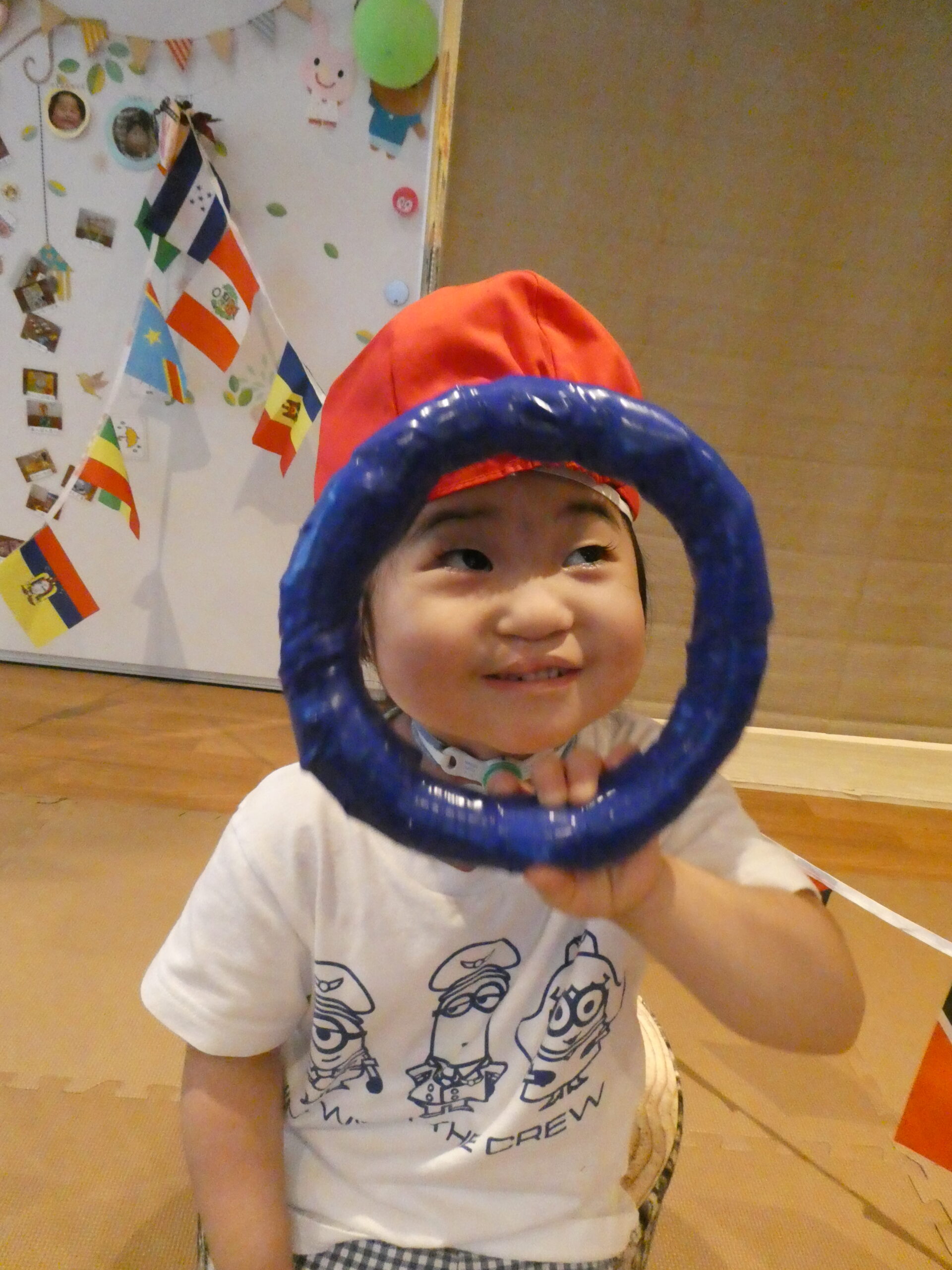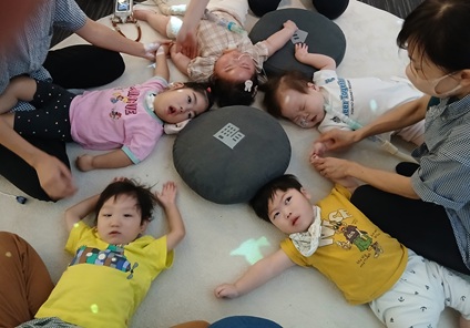 輪っかのバトンを手に握り、お隣のお友だちやスタッフにつないでいく協力プレー!