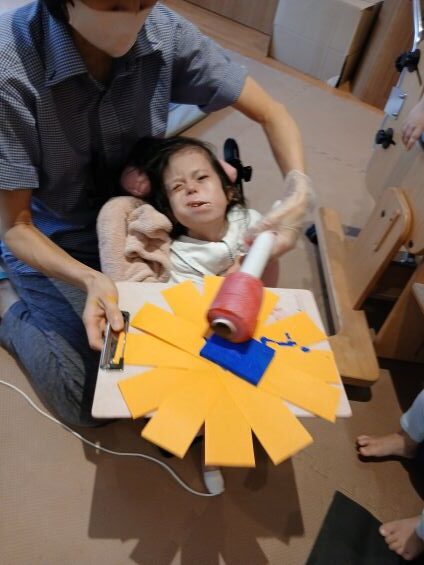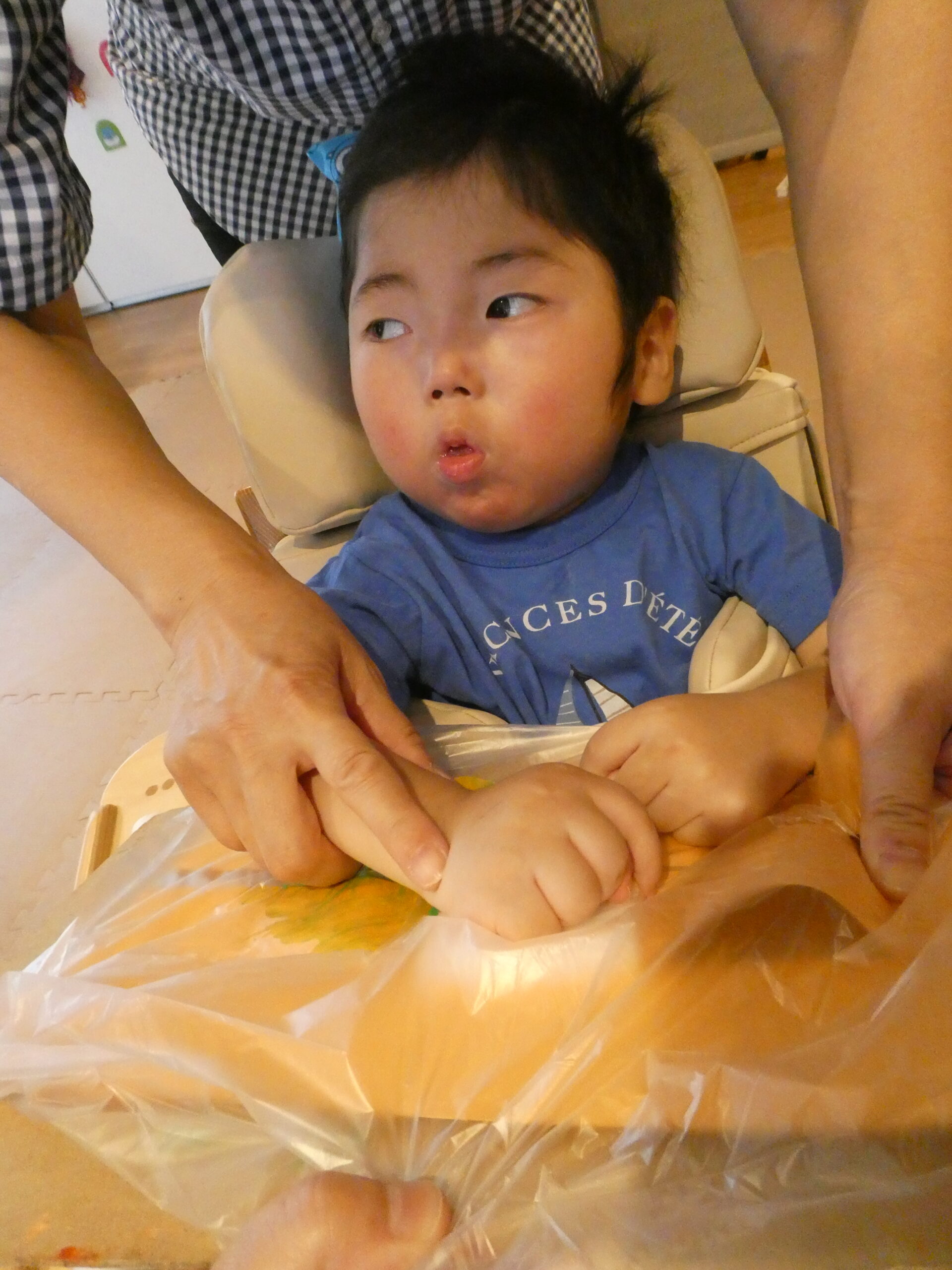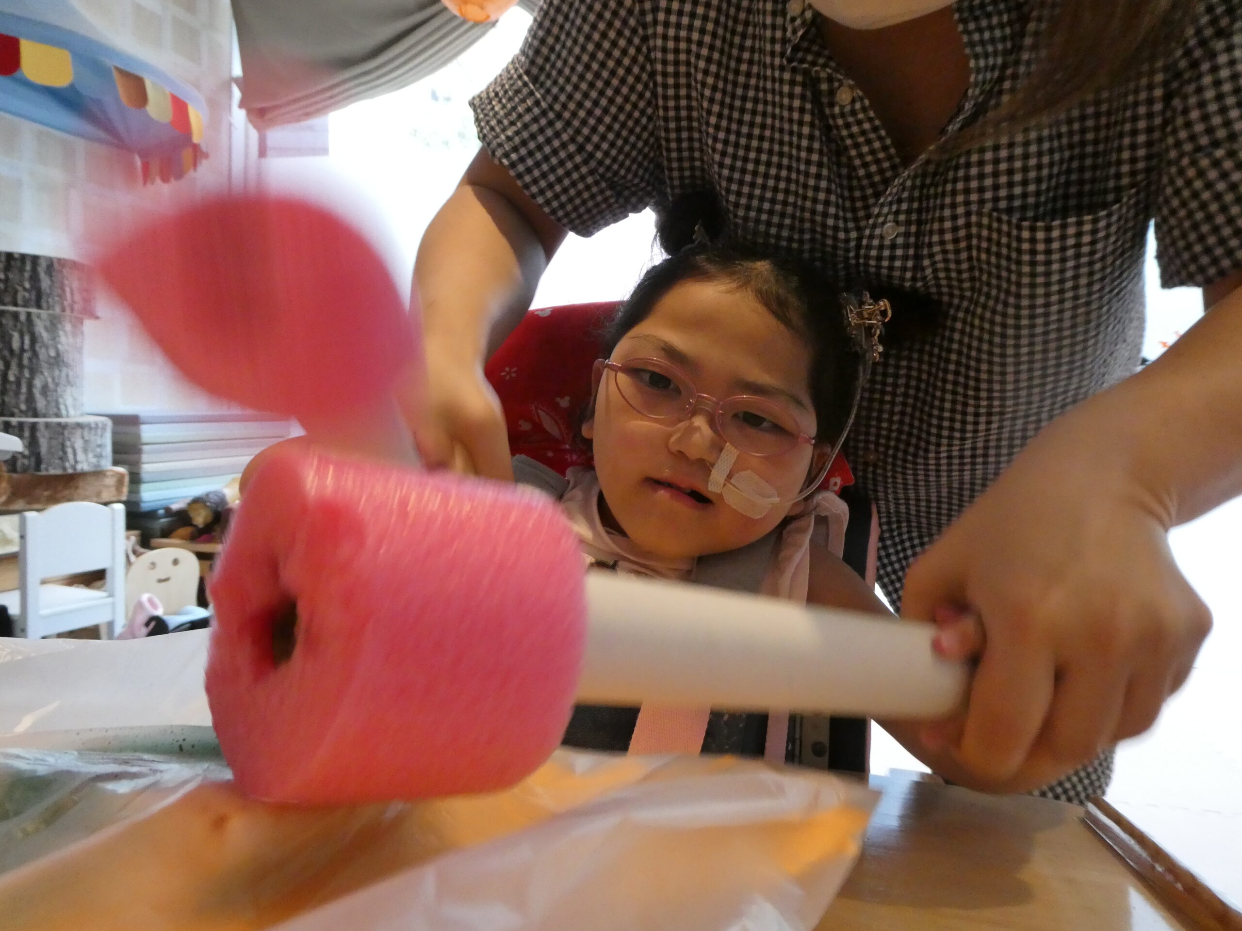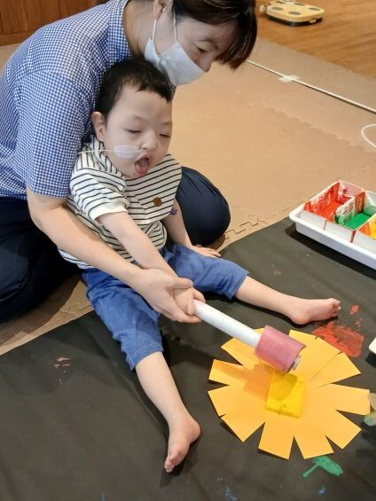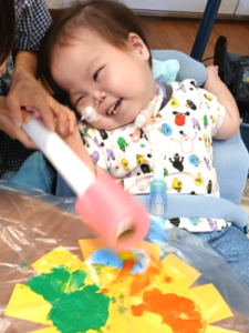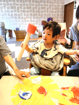 「芸術は爆発だ!!」ということで、今回は絵の具のついたスポンジをハンマーで叩いたり足や手を使って押して、飛び散る様子をダイナミックに楽しみます。