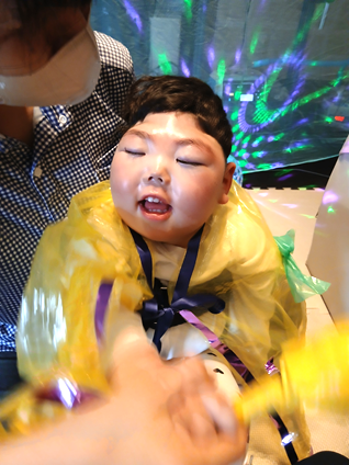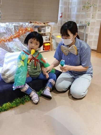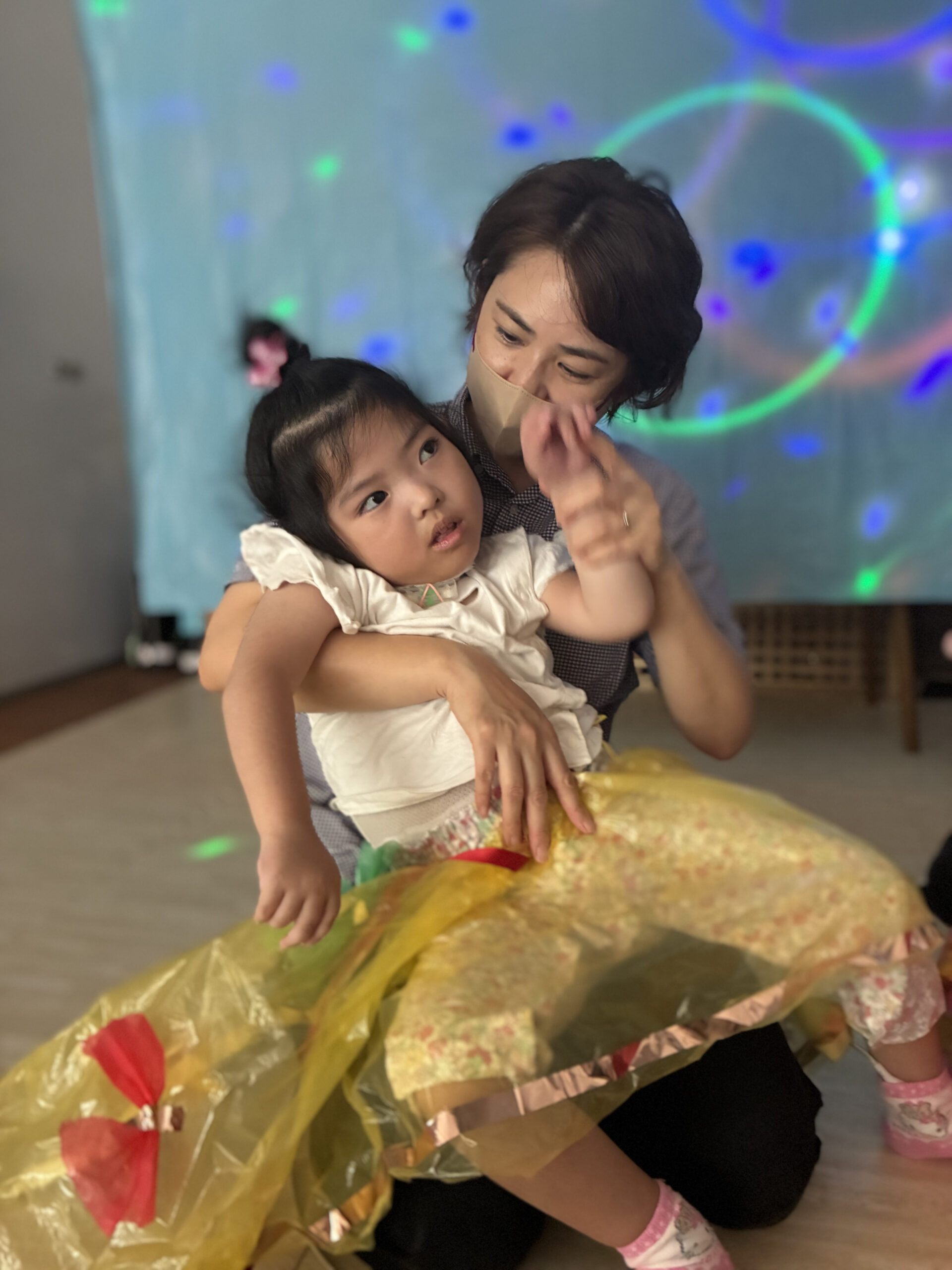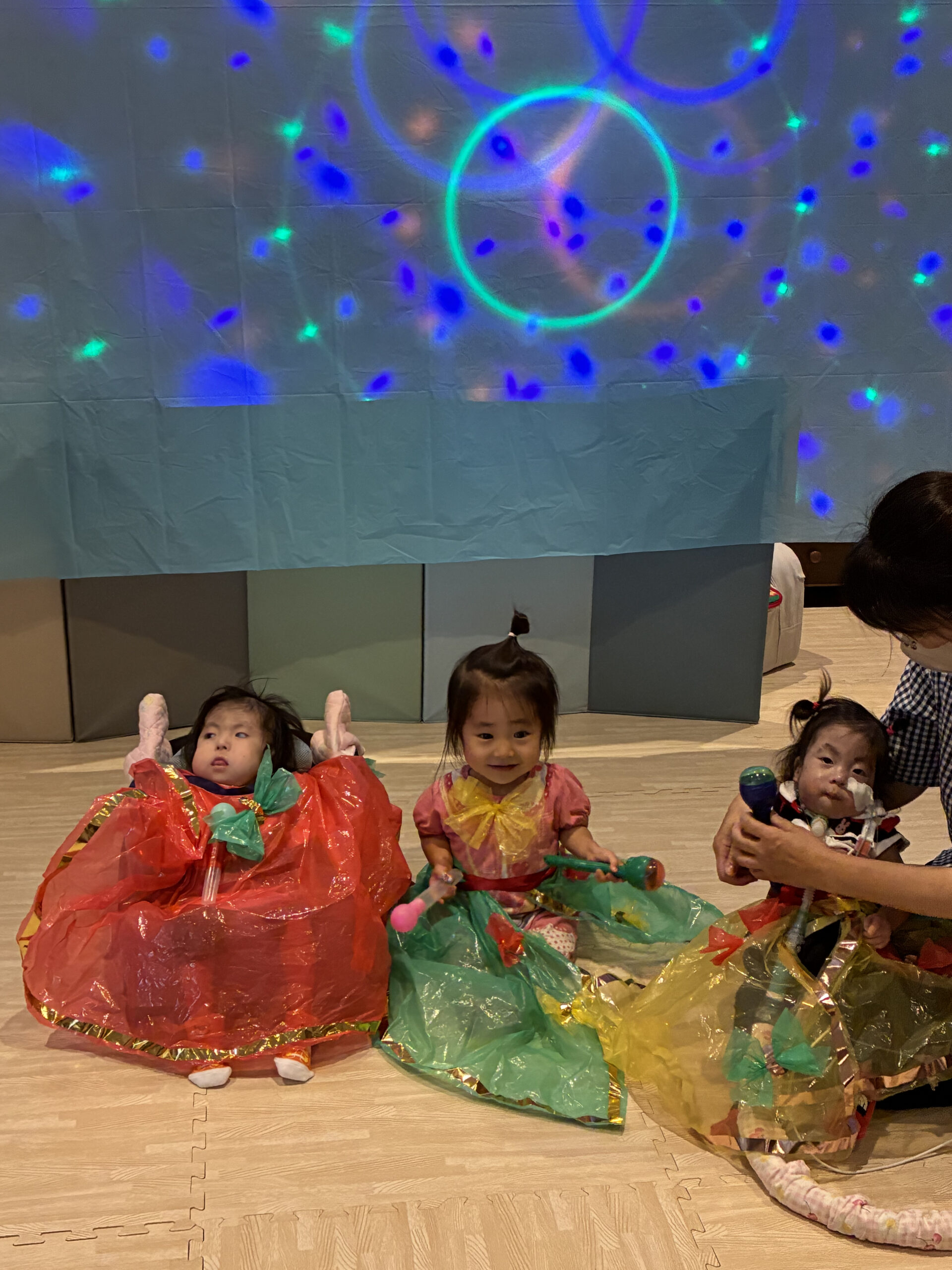アイドル役と観客役にわかれて、それぞれの立場でライブを楽しみます。アイドル役はキラキラの衣装を身に着け、マイクを持ち、照明や装飾の施された舞台に立ちます!ちょっぴり緊張気味のお子様やノリノリで楽しむお子様など反応もそれぞれでしたが、音楽が始まると観客の声援に後押しされ、どのお子様もとってもいい表情でした😊