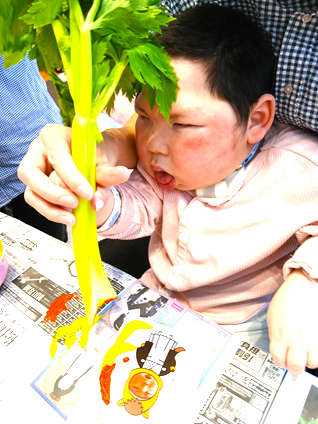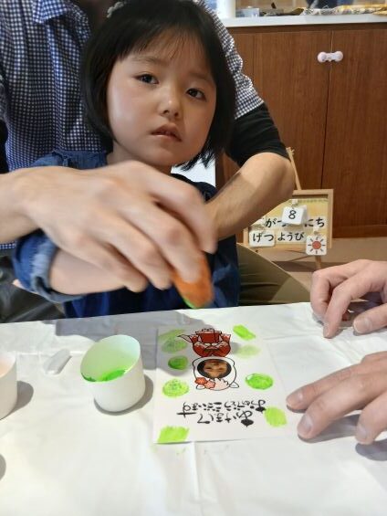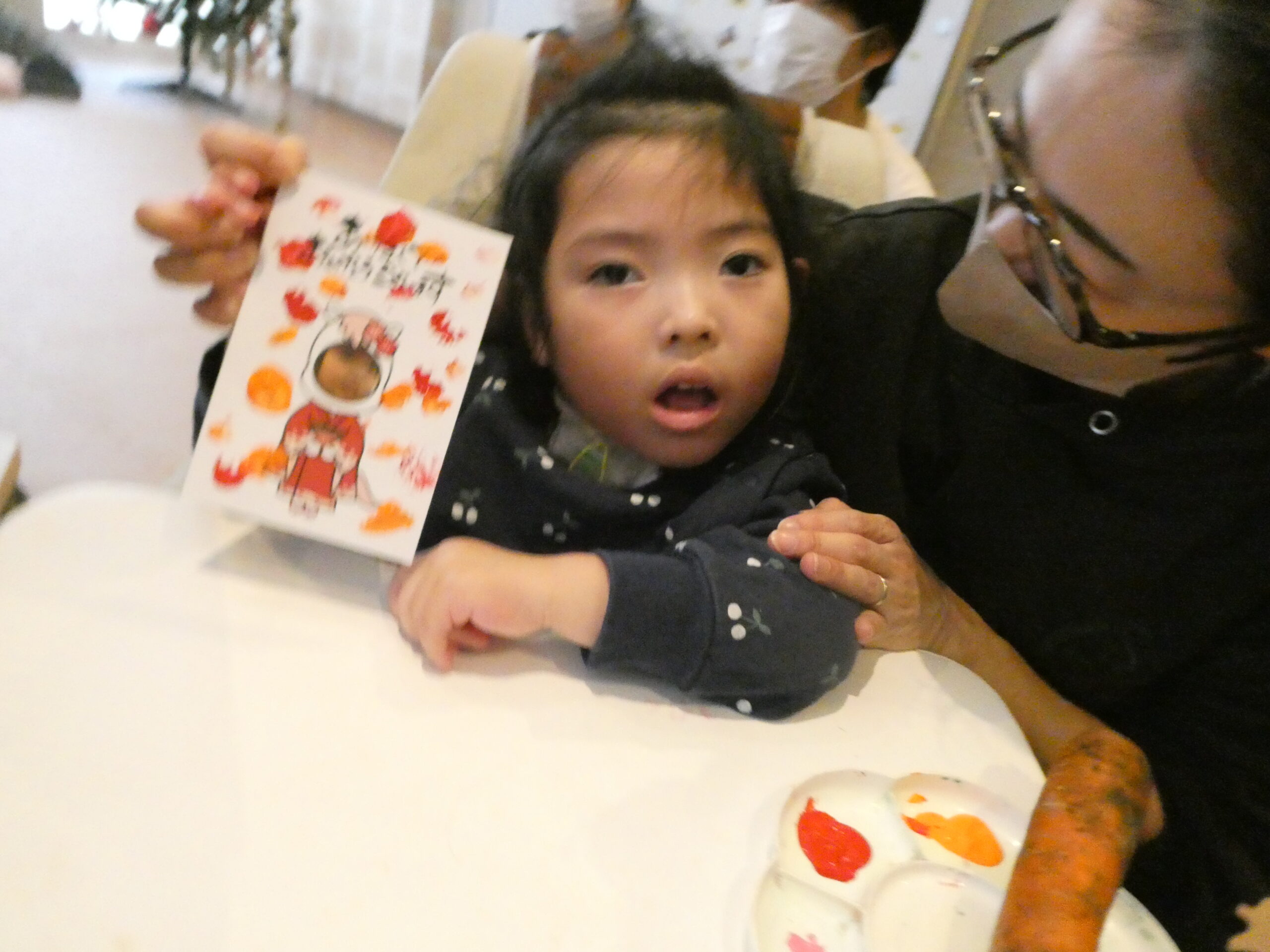 好きな色の絵の具を選び、野菜を手にしっかりと握ってポンポンポン。どの子もそれぞれに個性があり、新年にピッタリの色鮮やかな年賀状に仕上げていました。