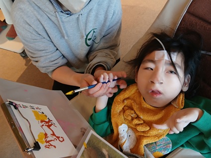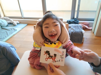 スタッフと一緒に筆を握り、真剣な表情でじっくり丁寧に描いていくお子様や、一人で豪快に筆を動かすお子様や、途中から筆ではなく指に絵の具を付けて芸術性あふれる馬の絵を完成させるお子様等、世界に一枚だけの素敵な年賀状が完成しました♬
